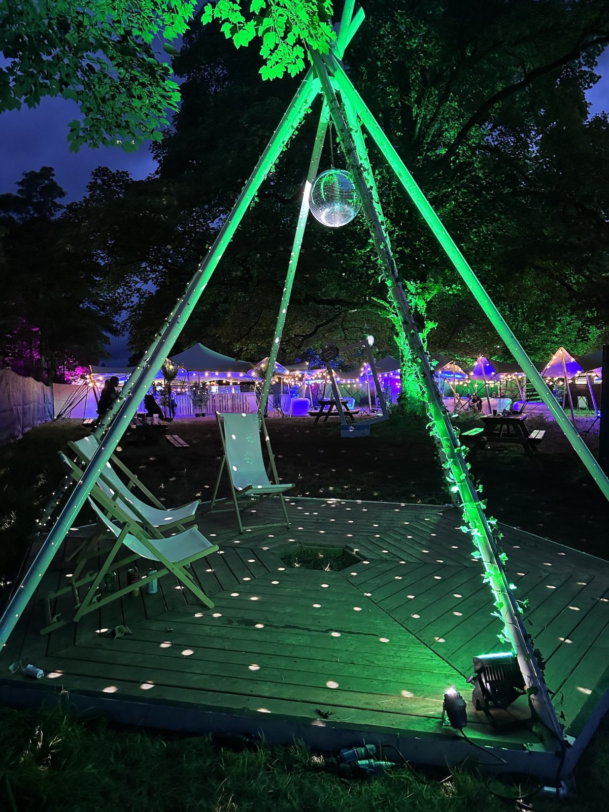We also repurposed our LED tipis into disco tipis - complete with uplighters and you guessed it, disco balls. There's something pretty magical about disco balls reflecting through a woodland area.